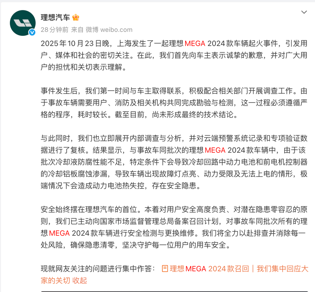 理想官方的另一则公告中,详细回应了10月23日上海的理想MEGA 2024款起火事故。