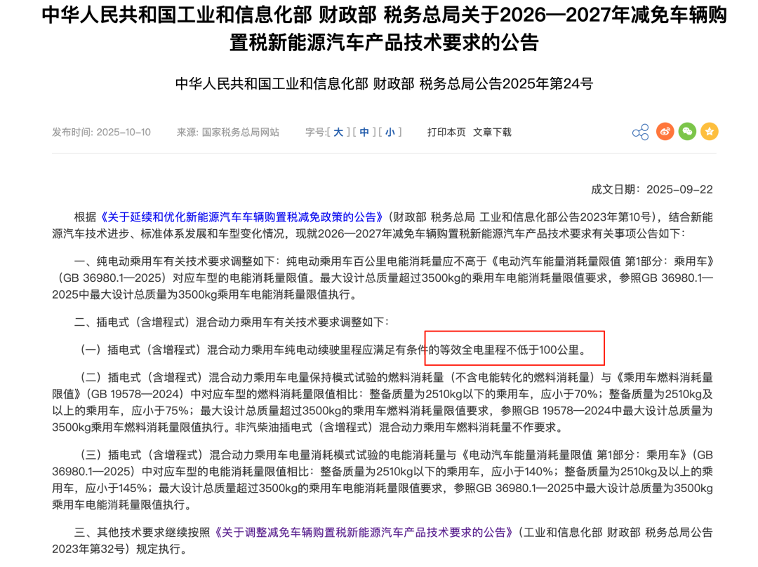 此外,近期有关部门也发文更新了明年新能源购置税减免的政策,首先是对产品做了技术要求,包括能耗、纯电续航里程和低温衰减等维度,一些10万级插混车型可能会受到影响。