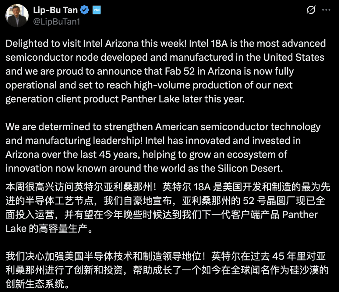 英特尔CEO陈立武在英特尔Ocotillo园区外展示Panther Lake的CPU晶圆10日上午,英特尔CEO陈立武参观完亚利桑那工厂后在社交媒体上表示,Intel 18A是目前美国本土开发与制造的*先进半导体节点,英特尔位于亚利桑那州的Fab 52工厂现已全面投入运营,并将在今年晚些时候实现Panther Lake的大规模量产。