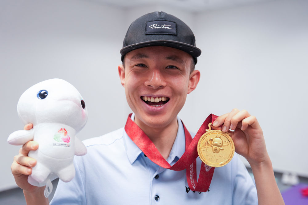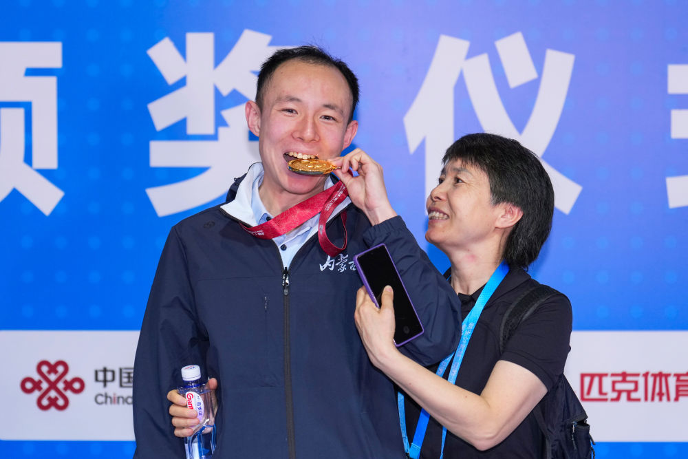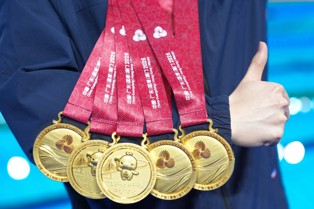 新华社江门12月15日电(记者伍志尊、齐芷玥)14日,全国第十二届残疾人运动会暨第九届特殊奥林匹克运动会特奥游泳赛场内浪花翻涌、掌声雷动。在男子22-29岁组4X50米混合泳接力决赛中,孙宇亮作为*后一棒一骑绝尘,帮助内蒙古队夺得金牌。这也是他在本届赛会上收获的第五枚金牌。 12月14日,孙宇亮在男子22-29岁组4X50米自由泳接力第1组决赛后庆祝夺冠。新华社记者 伍志尊 摄 1999年出生的孙宇亮,5岁时被确诊患有孤独症。与大众对孤独症患者“沉默内向”的刻板印象不同,他自幼便对运动充满热爱,滑冰、骑自行车、跑步以及各类球类运动都参与过。 2016年,孙宇亮作为首批队员进入呼和浩特特奥冰轮速滑队学习,开始特奥运动生涯。 孙宇亮家住鄂尔多斯,距离训练基地有两个多小时车程。为了保证每月4次训练,家人常年驱车往返接送,风雨无阻。夏天练轮滑、游泳和田径,冬天在户外冰场练习滑冰。 “每次训练结束回家的路上,他总是兴冲冲地跟我分享训练内容,盼着下一次训练快点到来。”母亲李铮说,自从入队训练、参加各种比赛之后,孙宇亮变得更加自信、开朗。 12月14日,孙宇亮展示本届赛会获得的五枚金牌。新华社记者 伍志尊 摄 长期刻苦的训练让孙宇亮在速滑、田径和游泳项目上不断突破。2019年,在阿联酋迪拜举办的第十五届世界夏季特殊奥林匹克运动会上,孙宇亮与队友为中国队夺得田径男子4X400米接力冠军。 在本次特奥游泳比赛中,孙宇亮的自信与活力使他成为全场焦点。每次入场时,他总会高高举起手臂,向看台上的观众热情挥手;刚触壁终点线,他便**时间向观众和裁判致意,用*纯粹的方式分享胜利喜悦。 “他特别享受比赛,一入场就是场上的‘显眼包’,比谁都兴奋。”孙宇亮的体能教练黄雅玲介绍,不论赛程多密集,他总能“满血复活”投入下一场比赛。 12日,孙宇亮在男子22-29岁组50米自由泳**组决赛中,以31秒36刷新个人*好成绩,夺得他本次赛会的首金。赛后,他反复念叨着这个数字,“比之前快,比之前更快了!” 12月12日,孙宇亮在男子22-29岁组50米自由泳第1组颁奖仪式后展示金牌。新华社记者 伍志尊 摄 14日的男子22-29岁组4X50米自由泳接力**组决赛更为惊心动魄。内蒙古队前三棒一直处于落后局面,孙宇亮接棒后纵身跃入泳池,瞬间开启“冲刺模式”。由于他习惯右侧换气,看不到左侧对手的位置,但凭借不服输的劲头,他*后50米实现精彩反超,观众席瞬间沸腾。“当时什么都没想,就想着拼尽全力往前游。” “所有运动里面我*喜欢游泳,*喜欢的运动员是潘展乐。”孙宇亮说。潘展乐在巴黎奥运会男子4X100米混合泳接力决赛中上演*后一棒超级逆转,助中国队夺下金牌,孙宇亮则在全国残特奥赛场上致敬了自己的榜样。 12月12日,孙宇亮(左)和母亲在男子22-29岁组50米自由泳第1组颁奖仪式后合影。新华社记者 伍志尊 摄 从跨城训练的常年坚持,到国内外赛场屡创佳绩,运动不仅让孙宇亮收获了荣誉,更让他突破了孤独症带来的障碍,变得愈发自信、开朗、坚韧。正是这份对运动的热爱与坚持,让他在自己的赛道上熠熠生辉。