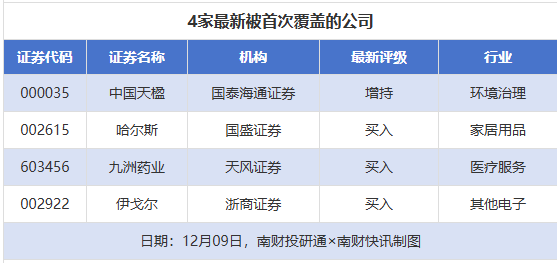 首次覆盖方面,12月9日券商共给出了4次首次覆盖。其中,中国天楹获得国泰海通(20.090, -0.19, -0.94%)证券给予“增持”评级,哈尔斯获得国盛证券(17.380, -0.08, -0.46%)给予“买入”评级,九洲药业获得天风证券(4.270, -0.02, -0.47%)(维权)给予“买入”评级,伊戈尔(30.590, -0.61, -1.96%)获得浙商证券(11.000, 0.00, 0.00%)给予“买入”评级。