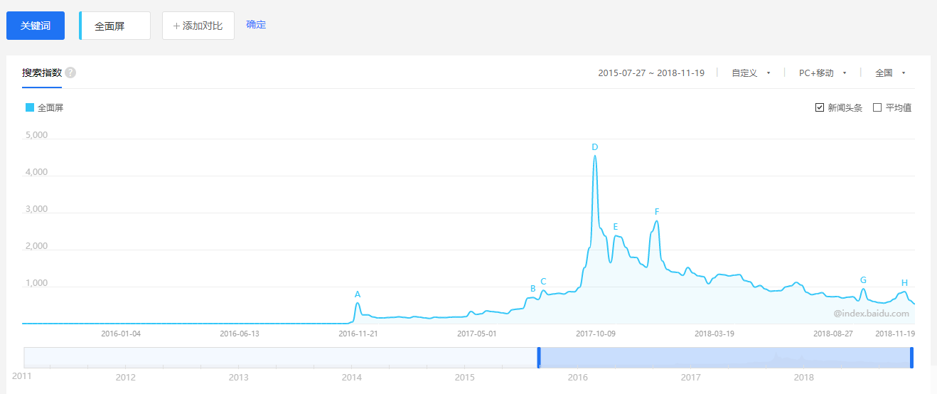 百度指数显示,关键词“全面屏”搜索指数*大值出现在2017年9月份,正值iPhone X发布。自那之后,刘海屏也变成全面屏手机*常见造型。